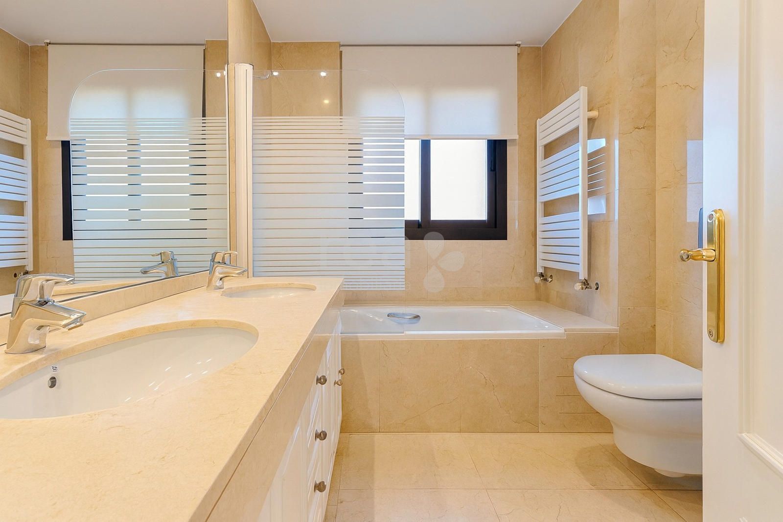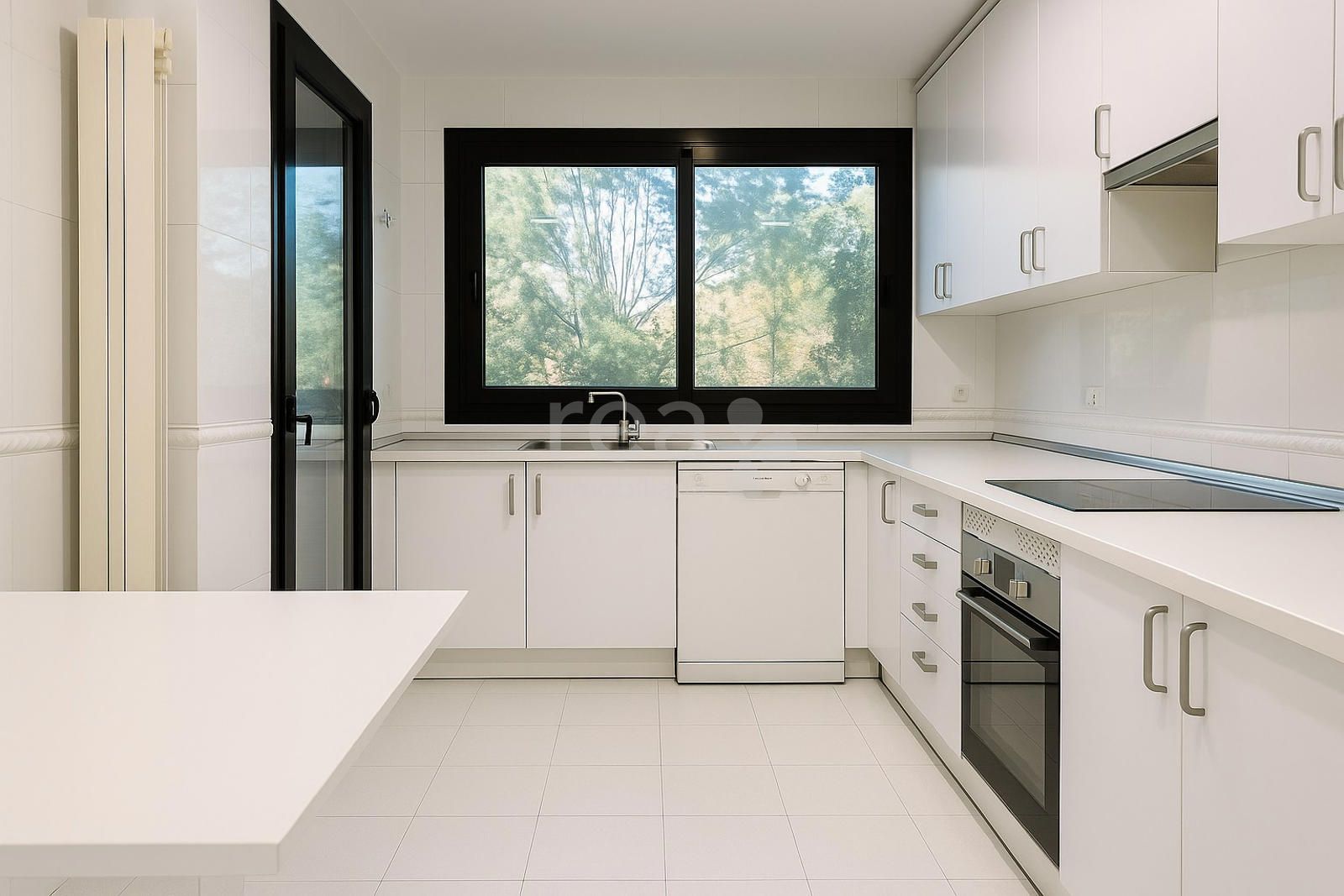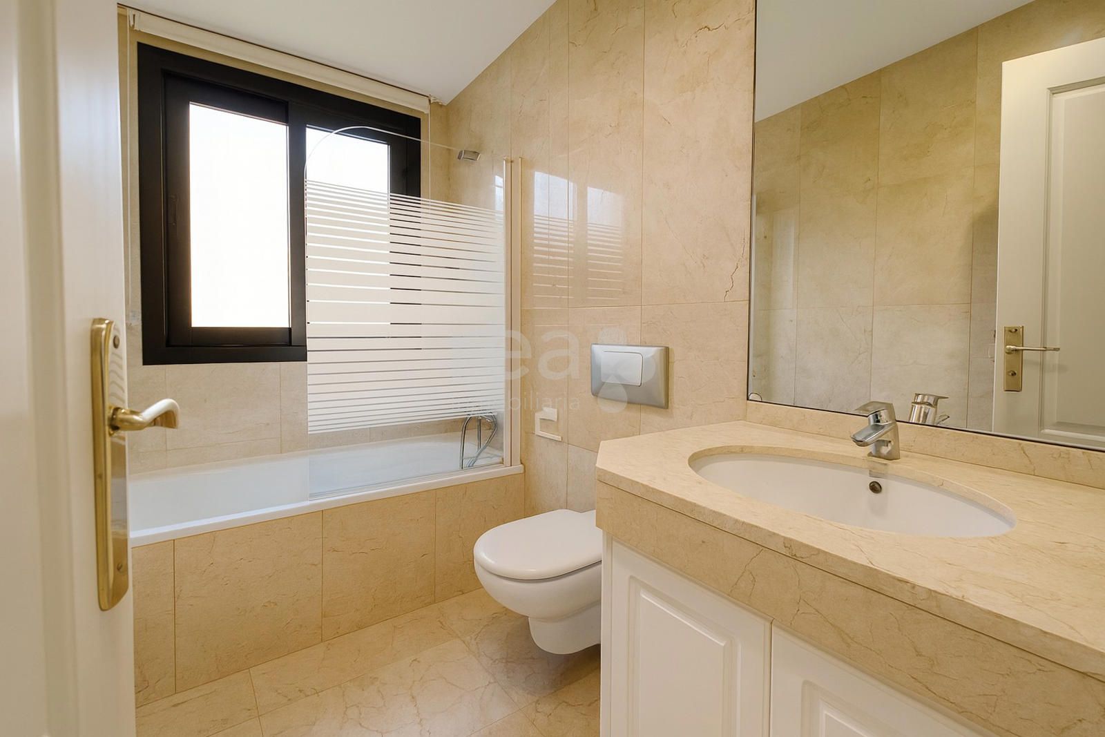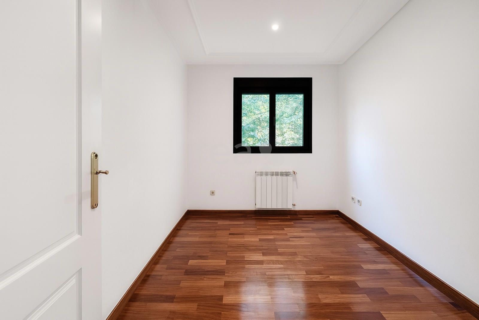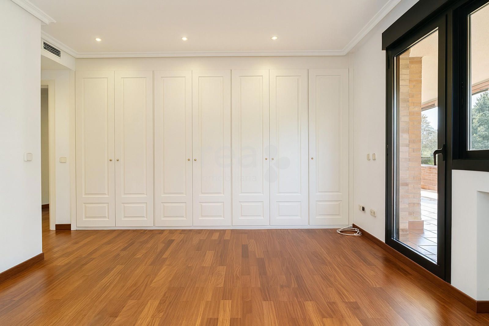 The property, unfurnished and filled with natural light, enjoys stunning views of the landscaped communal areas. It features an entrance hall, a fully equipped kitchen with breakfast area and laundry room, staff bedroom with bathroom, and a spacious living room with fireplace connected to a separate dining area—both with access to the terrace. The sleeping area includes three bedrooms and two bathrooms, offering a comfortable and functional layout for family living.