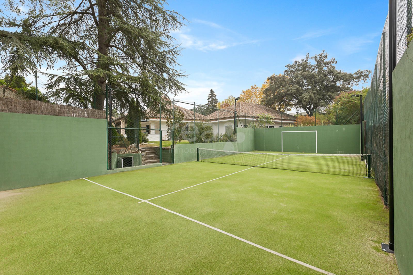 Set on a flat 3,400 m² plot with a beautifully landscaped garden, swimming pool, paddle tennis court and spacious covered porches, the house offers over 1,300 m² distributed mainly on a single floor, with five en-suite bedrooms.