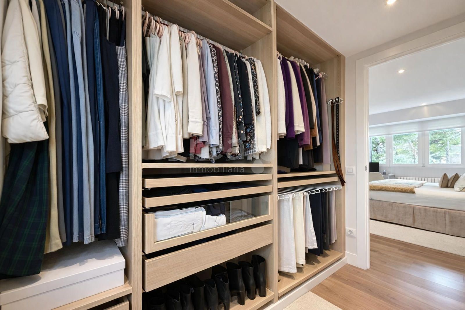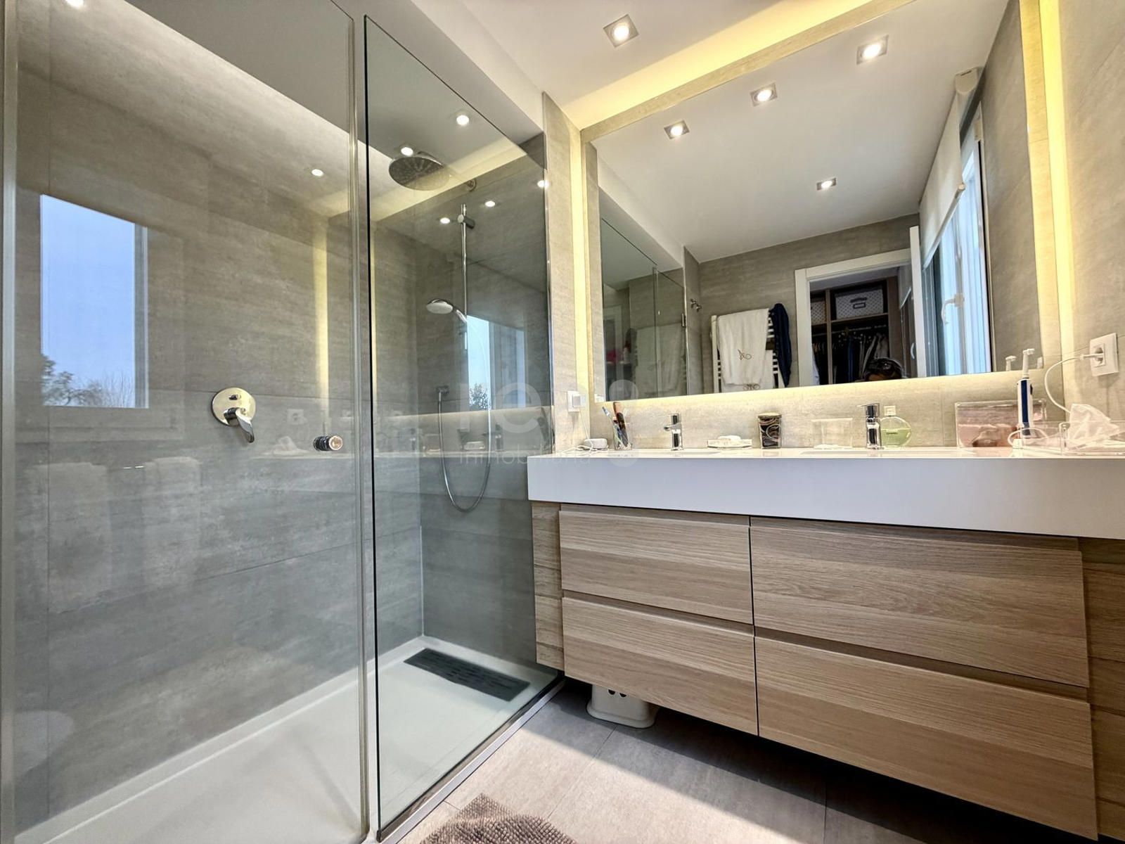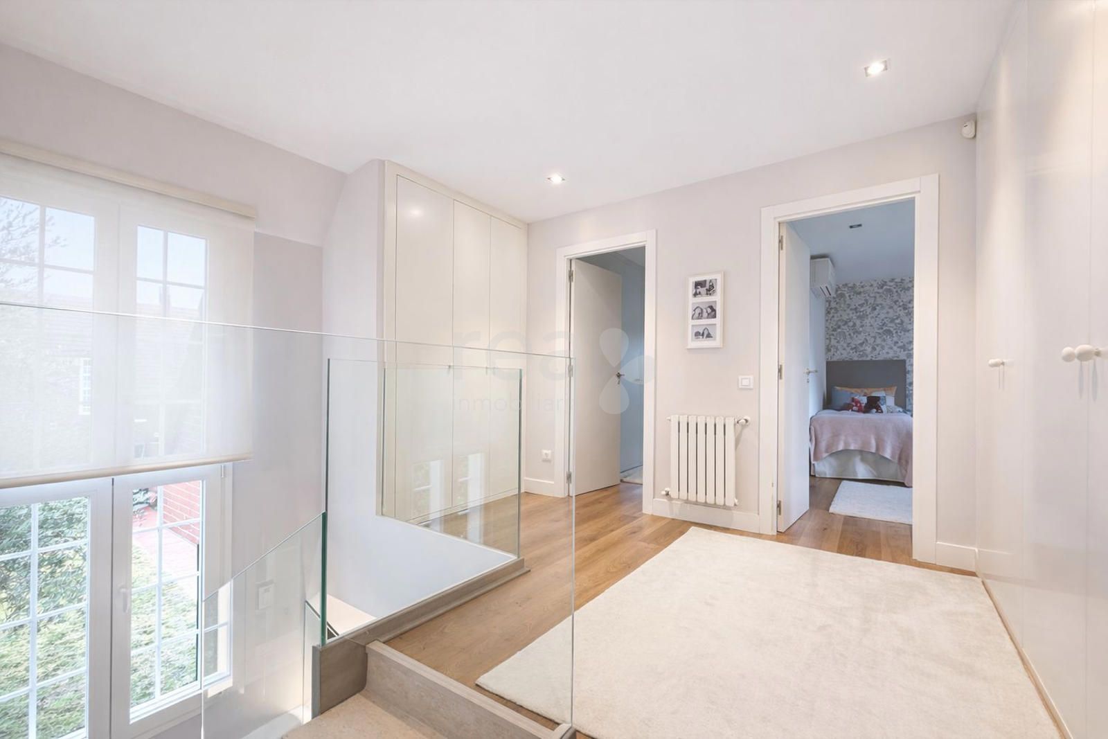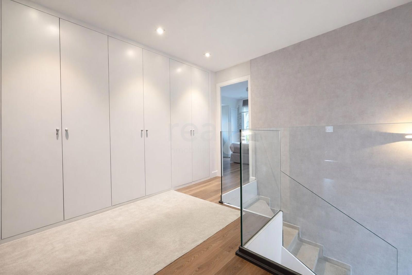 La subida a la primera planta nos conduce a un holgado descansillo con gran cantidad de armarios empotrados, alrededor del cual se distribuyen tres dormitorios con baño en suite. El principal tiene además walking closet y vestidor. Todas las habitaciones disponen de ventanas de buen tamaño y armarios empotrados.