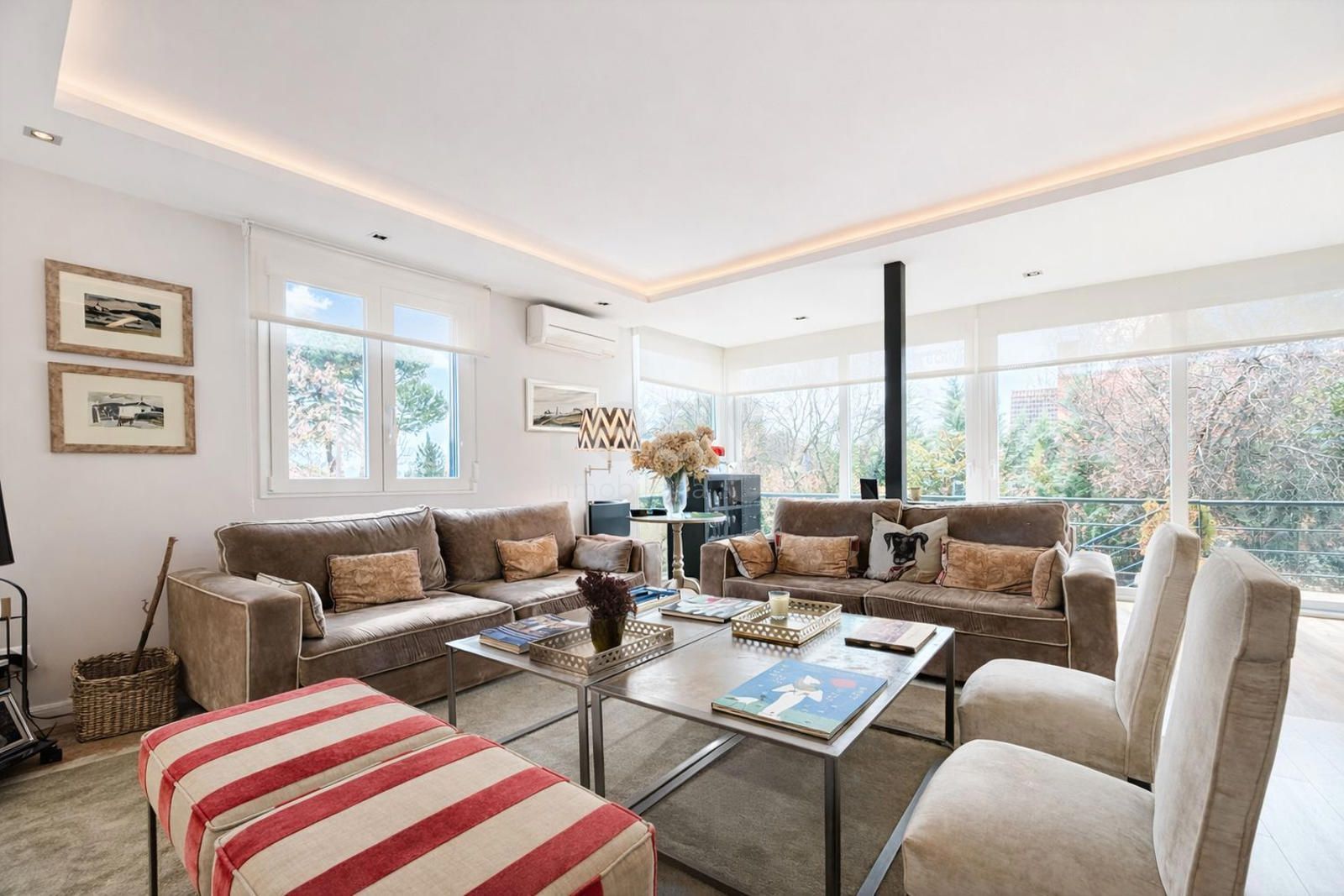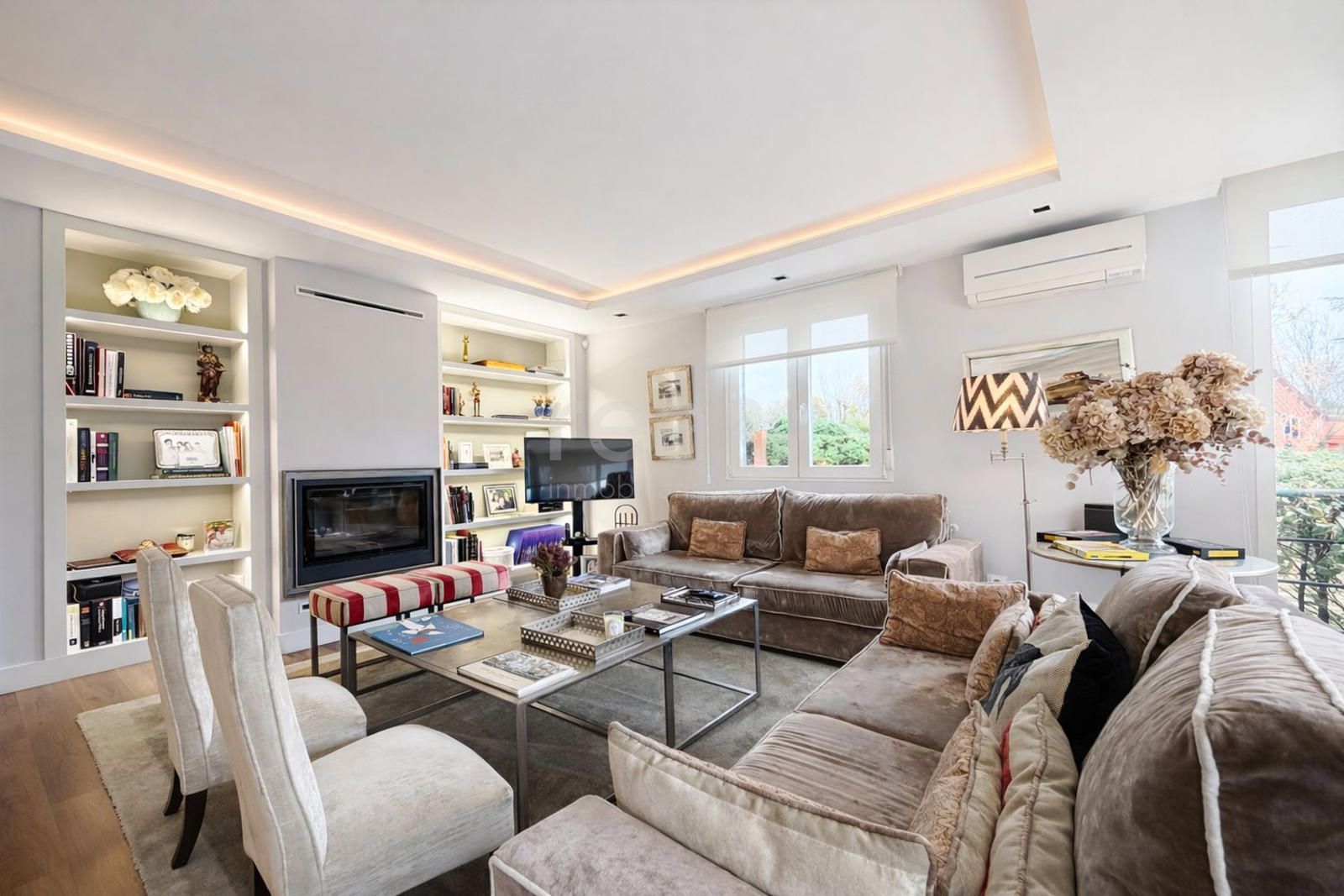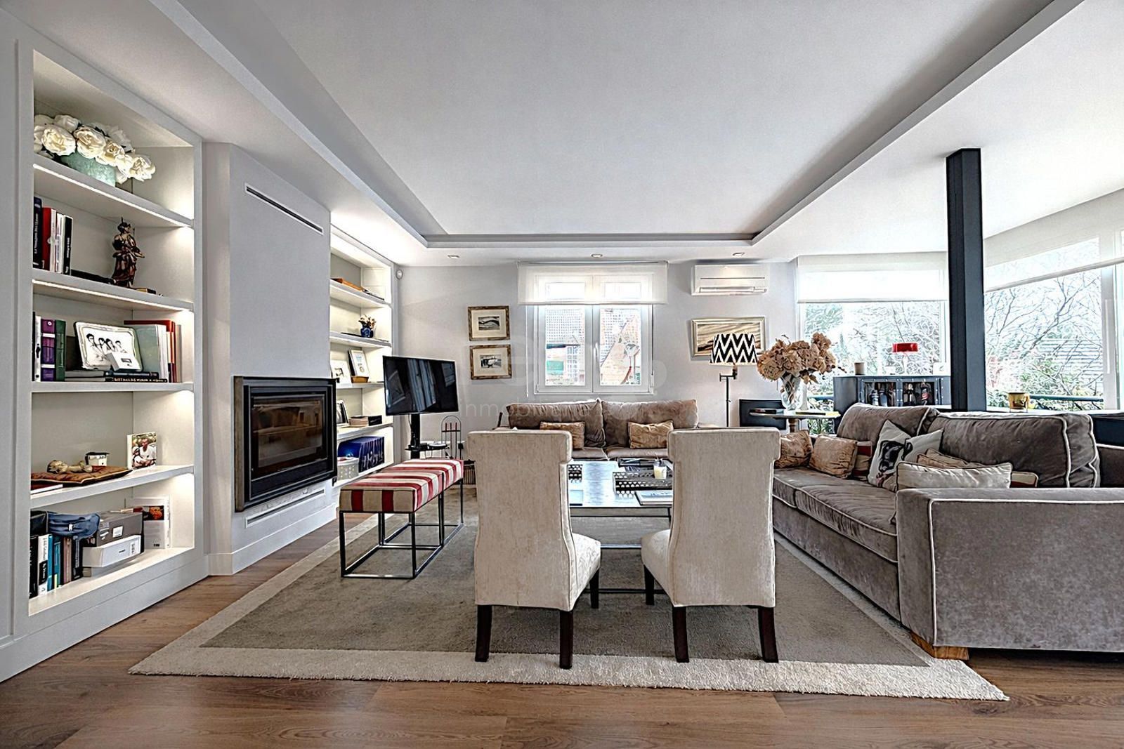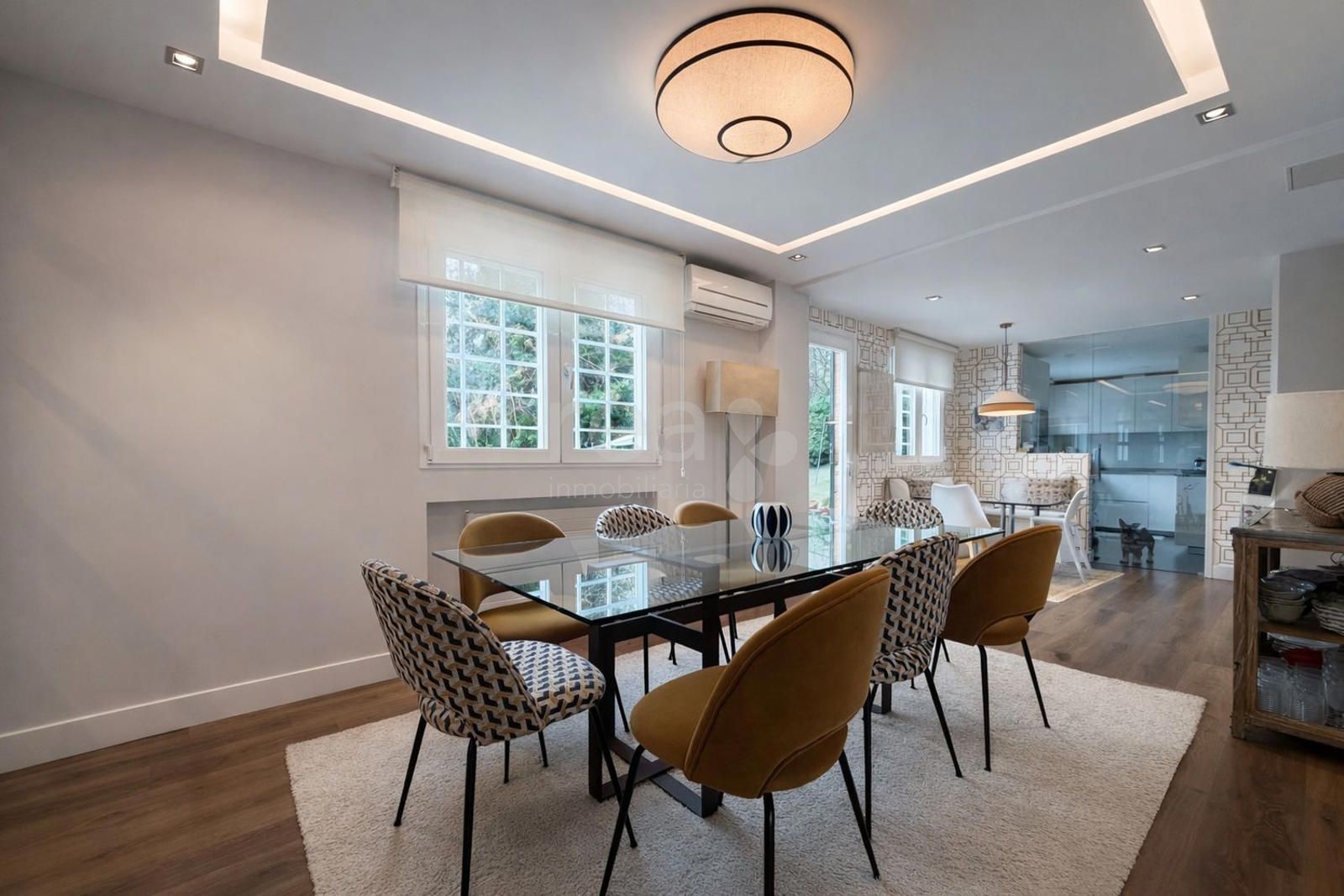 La planta de entrada alberga un bonito salón con chimenea de cassette y salida a la terraza-porche, con bajada a la zona de piscina del jardín. Grandes ventanales con carpintería de alta gama de Cortizo aseguran la entrada de la luz. En este nivel encontramos igualmente un comedor independiente, una moderna cocina con office grande, un despacho, un dormitorio de invitados con baño completo y un aseo de cortesía.