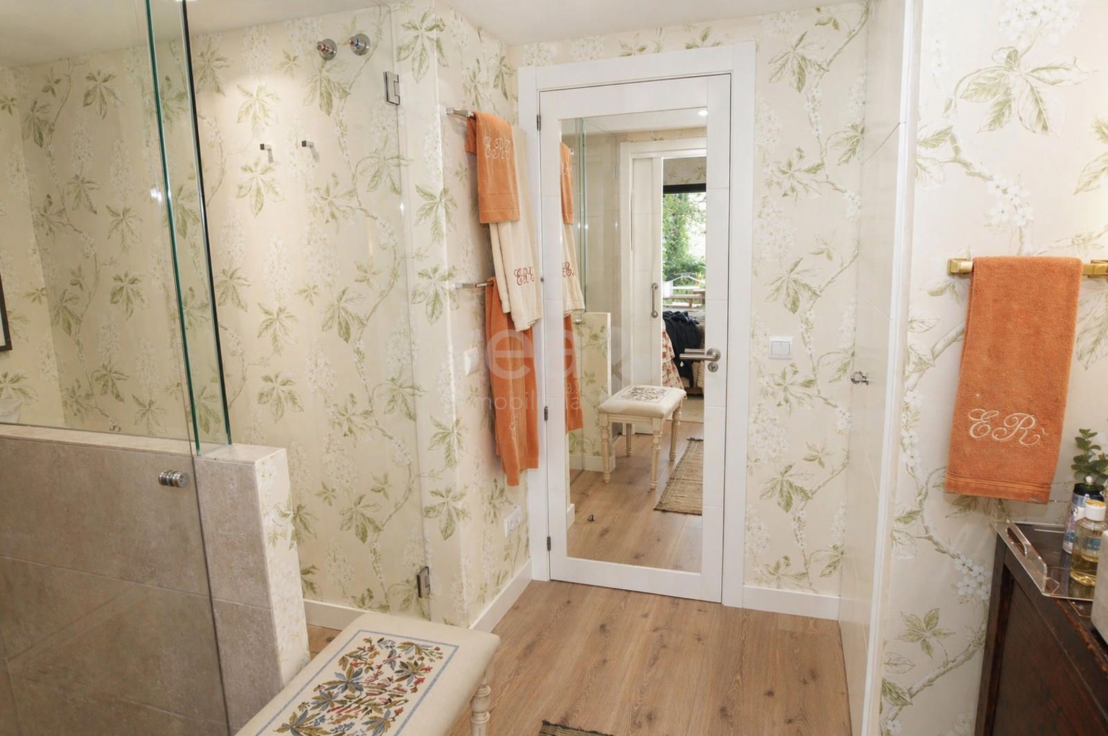 La zona de descanso se distribuye a través de un cómodo pasillo y alberga tres amplios dormitorios y tres baños. Dos de los dormitorios cuentan con baño en suite, destacando el dormitorio principal por su salida directa al jardín, aportando una sensación de calma y privacidad muy poco habitual.