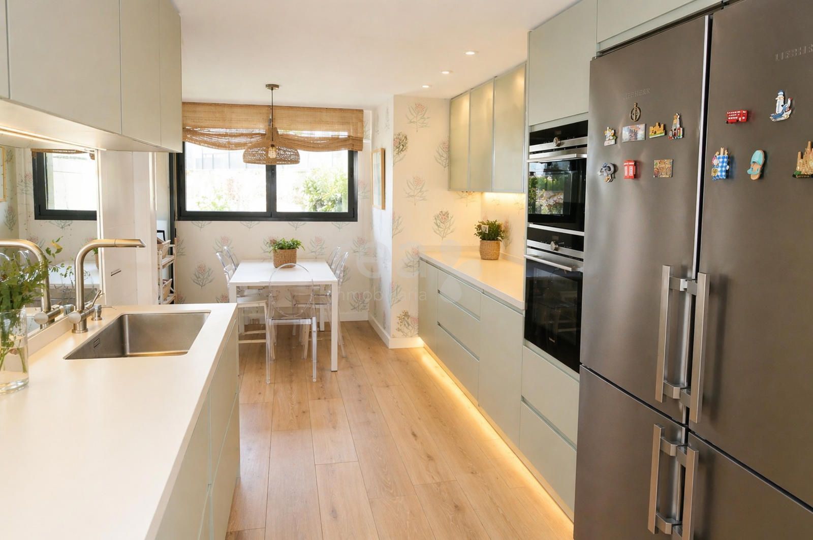 La cocina, moderna y funcional, está equipada con mobiliario y electrodomésticos de primera calidad, y dispone de acceso a la zona de servicio, que incluye dormitorio con baño en suite y tendedero independiente.